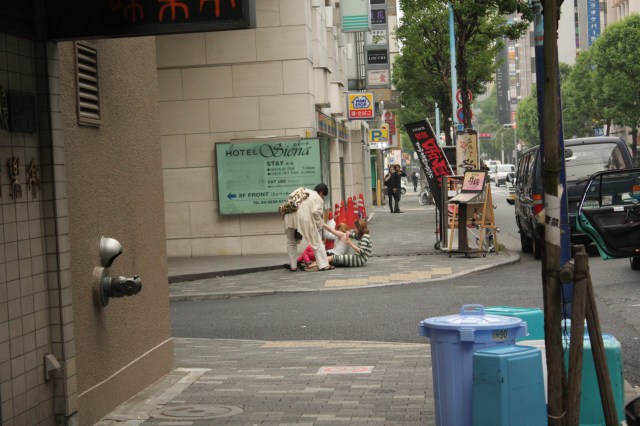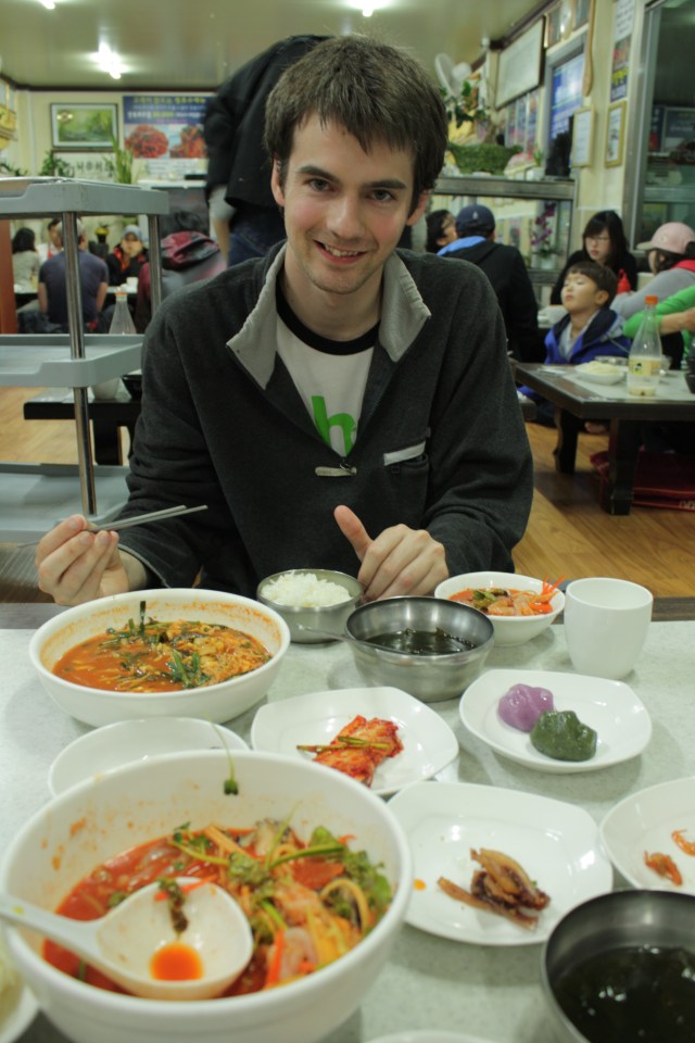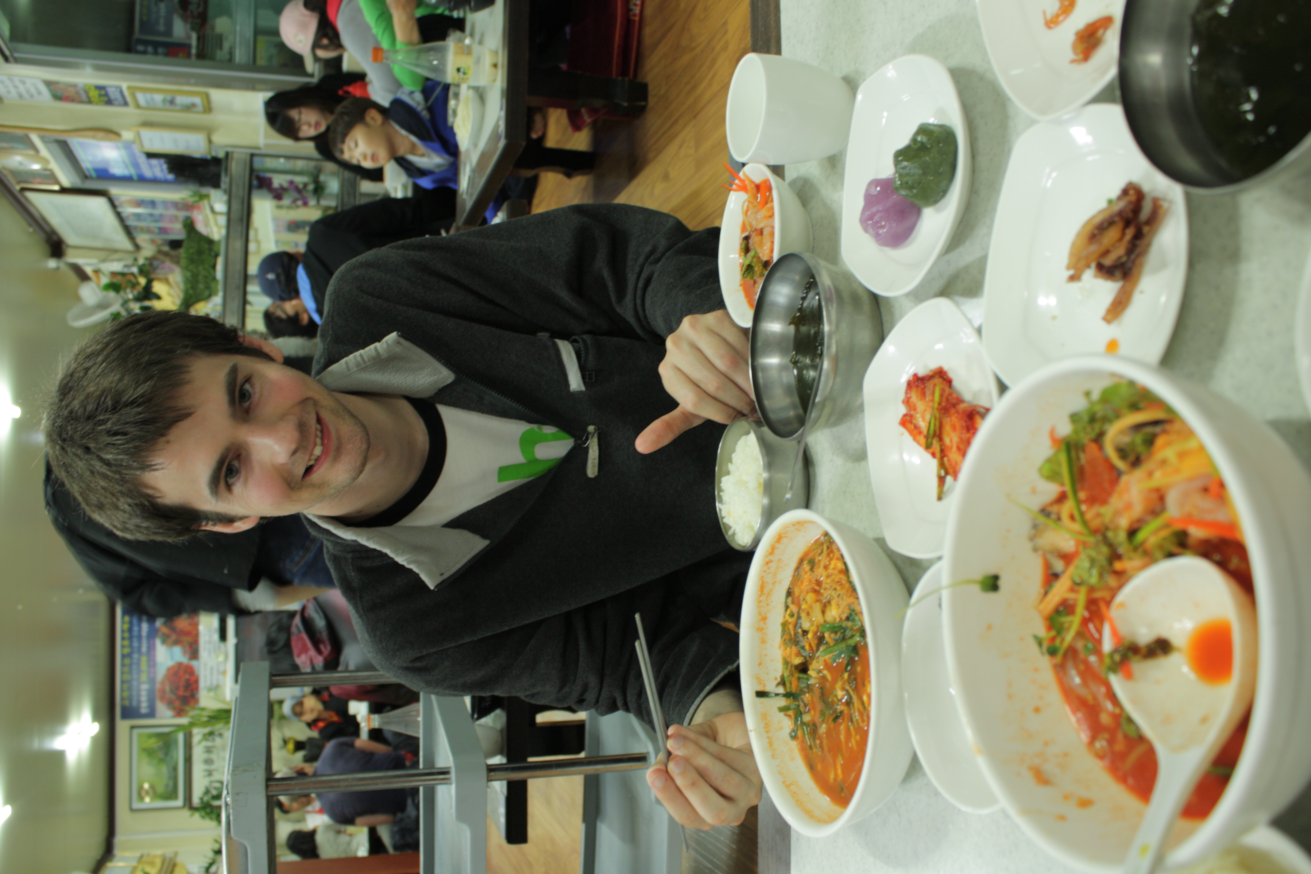 After that we wandered the town, walked along the beach, sipped americanos from a beachside cafe and watched little kids in powerwheels and South Korean Army men zip around on minibikes. It is a beautiful town and I highly recommend a visit. For dinner we stopped at a “fresh raw fish restaurant,” Andrew ordered for the both of us and we were rewarded with a delicious and spicy seafood soup that reminded me of jambalaya as well as a cold dish with raw abalone. The latter was not my favorite, but it wasnt inedible, but it was icy cold, too sweet and the abalone crunched in my mouth with audible popping sounds. (My brother has difficulty sitting cross legged, which entertained me to no end as he struggled to get comfortable at the table)