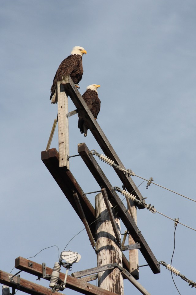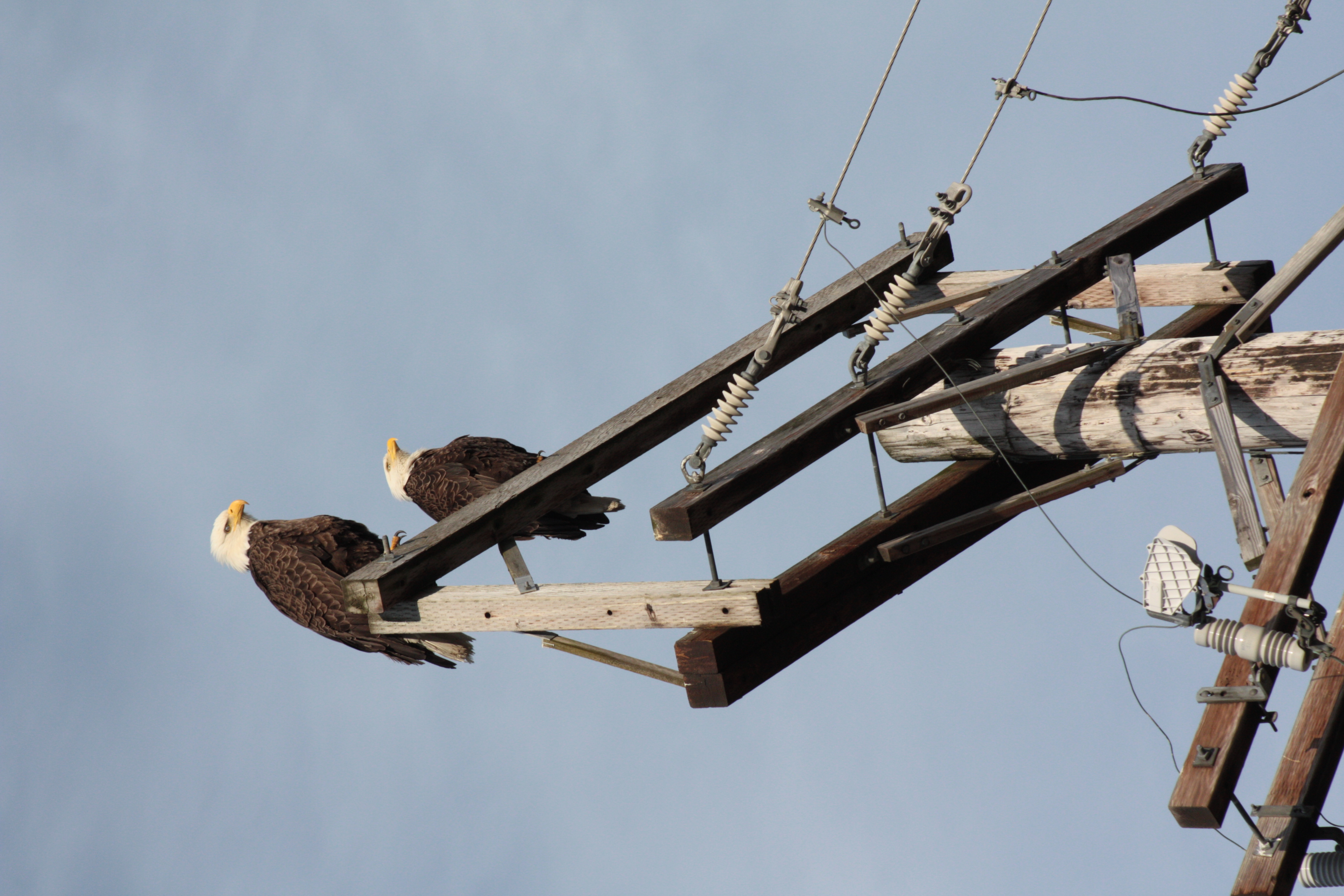 A few days ago I had the pleasure of watching the bald eagle’s mating ritual. It starts with loud chirping screams as one eagle circles and approaches the other eagle (perched on a power line). The eagle lands and they begin to elaborately call to one another, sometimes it sounds like a car alarm at other times a furious banshee. They ruffle their tail feathers, stretch their wings, inch in close to one another and stumble back away again, flirting like shy middle school kids at their first dance.