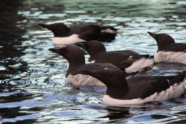 They are able to fly with some agility, but diving is where these birds excel. They look like graceful slim line torpedoes in the water and they have been recorded plummeting to depths of more than 600 feet. Often times they can be spotted in huge groups on the water (rafts). There can be more than 2,000 murres floating in the middle of the ocean. It’s a pretty amazing sight to watch hundreds of murres dive under the water simultaneously.