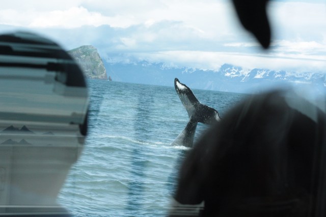 For perspective, here’s an accidentally surreal photo of people on the bow of the boat in the foreground and Morgan’s tail in the background (taken from the ship’s bar as I was, you know, working).